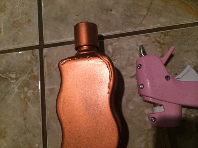 Step 7: Grab your glue gun and start gluing the edges of the bottle and place the burlap on top. Glue a couple of inches at a time so you have the flexibility of moving the burlap around.